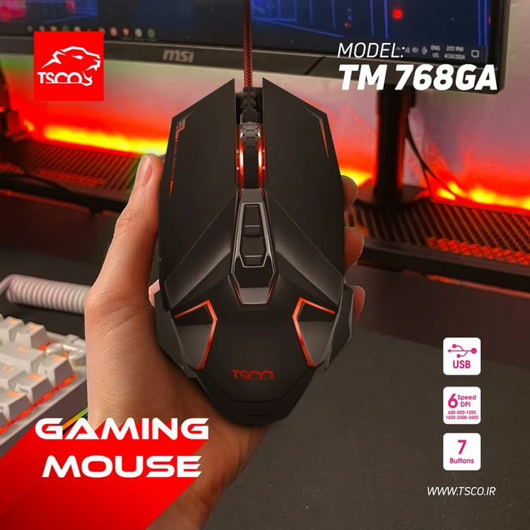 ماوس TM 768GA از لحاظ فنی یک ابزار قابلاتکا برای انجام فعالیتهای حرفهای، طراحی گرافیکی، بازیهای رایانهای و کارهای روزمره محسوب میشود. این ماوس از طریق درگاه USB A به دستگاه متصل میشود و با اتصال سیمی پایدار، نگرانی از بابت قطعی یا تأخیر در دریافت فرمانها را کاملاً از بین میبرد. این مدل باقابلیت تغییر DPI از 600 تا 3200، امکان تنظیم دقت حرکت ماوس را بر اساس نوع فعالیت فراهم میسازد. بهطور پیشفرض روی 800 DPI تنظیم شده، اما بسته به نیاز میتوان آن را روی 1200، 1600، 2400 یا حتی 3200 تنظیم کرد. از نظر دوام، سوئیچهای ماوس تا 3 میلیون بار کلیک تضمین شدهاند که نشاندهنده طول عمر بالا و کیفیت ساخت قابلاعتماد آن است. ماوس تسکو مدل TM 768GA دارای دو کلید جانبی در قسمت کناری بدنه است که برای عملکردهای اضافه یا کلیدهای میانبر بسیار کاربردی هستند. کابل 1.8 متری این مدل از جنس کنفی بافتهشده ساخته شده که علاوه بر مقاومت بالا در برابر کشش و گرهخوردگی، انعطافپذیری مناسبی نیز دارد. این ویژگی باعث میشود تا در حین کار یا بازی، آزادی حرکت بدون مزاحمت فراهم باشد. ماوس TM 768GA با طراحی مشکی و نورپردازی LED، جلوهای مدرن و حرفهای به میز کار یا ست گیمینگ شما میدهد. طراحی این ماوس بهگونهای است که هم از نظر بصری چشمنواز باشد و هم از نظر کاربردی، راحتی و دقت را تأمین کند. بدنه این محصول از جنس پلاستیک ABS مقاوم ساخته شده که در برابر ضربه و خطوخش مقاومت خوبی دارد. علاوهبرآن، با ابعاد 128 در 68 در 37 میلیمتر، فرم آن بهگونهای طراحی شده که در دست گرفتن آن حتی در استفادههای طولانی، احساس خستگی ایجاد نکند . نورپردازی LED در بخشهای مختلف بدنه، ظاهری حرفهای و متمایز به TM 768GA میدهد. این نورپردازی نهتنها جنبه زیبایی دارد؛ بلکه در محیطهای تاریک نیز به کمک کاربر میآید و استفاده از آن را راحتتر میکند. در مجموع، طراحی ظاهری این ماوس بهگونهای انجام شده که علاوه بر جذابیت بصری، کاملاً با اصول ارگونومی و راحتی کار هماهنگ باشد. این ویژگیها باعث میشود تا TM 768GA یک انتخاب ایدهآل برای کاربران دقیق و حساس به جزئیات باشد.