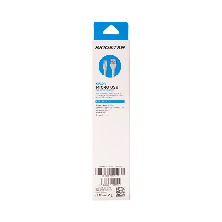 شما با استفاده از کابل micro-USB کینگ استار مدل K520A میتوانید علاوه بر شارژ تلفن همراه خود، اطلاعاتتان را نیز منتقل کنید. در یک سمت این کابل ساخت ایران یک کانکتور micro-USB و در سمت دیگر آن یک کانکتور USB وجود دارد. سمت micro-USB آن مناسب برای تمامی دستگاههای مجهز به این نوع درگاه است. قسمت کانکتور USB آن با لپتاپ، شارژرهای دیواری، پاوربانک و دیگر دستگاههای دارای این درگاه سازگار است. مقدار شدت جریان خروجی این کابل 2.1A است. از دیگر موارد مهمی که میتوان به آن اشاره نمود دوام بالا و کارایی مهم این کالاست. در واقع این کابل با 25 سانتی متر طول برای شارژ دستگاههایی از قبیل ایربادز و هدفون و سایر کالاهای دیجیتال مناسب است که این طول کم موجب کمترین قطع جریان خواهد بود و به دستگاه شما آسیبی نخواهد زد. کابل micro-USB کینگ استار مدل K520A به طول 25 سانتیمتر، در رنگ مشکی و با جنس روکش PVC عرضه شده است. از مزایای مهم این روکش میتوان به مقاوم بودن آن در برابر کشیده شدن و پارگی اشاره کرد.